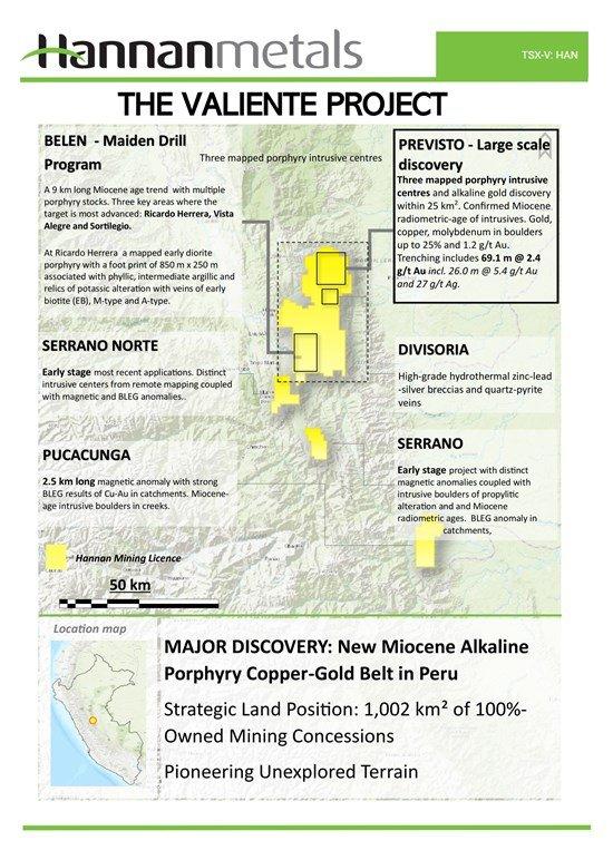 - Public participation meetings outlining Hannan’s exploration plans will be held in the hamlets of Nueva Palestina, Inca Garcilazo, Chancadora and Previsto, where the communities are on record as approving the company’s proposed drill program;