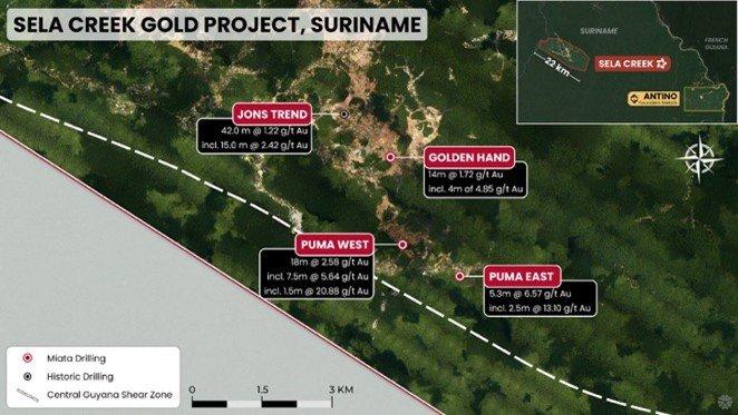 Miata Metals Corp. (CSE: MMET) (FSE: 8NQ) (OTCQB: MMETF) (- https://www.commodity-tv.com/play/miata-metals-company-insight-from-the-ceo-and-drill-program-at-sela-creek-starting-soon/  – ) (“Miata” or the “Company”) is pleased to announce significant drill results from two different targets at its Sela Creek Gold Project (“Sela Creek” or the “Project”) in Suriname. Results include near-surface, high-grade mineralization in hard rock at the Puma Target (“Puma”) and wide mineralized intervals at depth at the Golden Hand Target (“Golden Hand”), further demonstrating the district-scale potential of Sela Creek.
