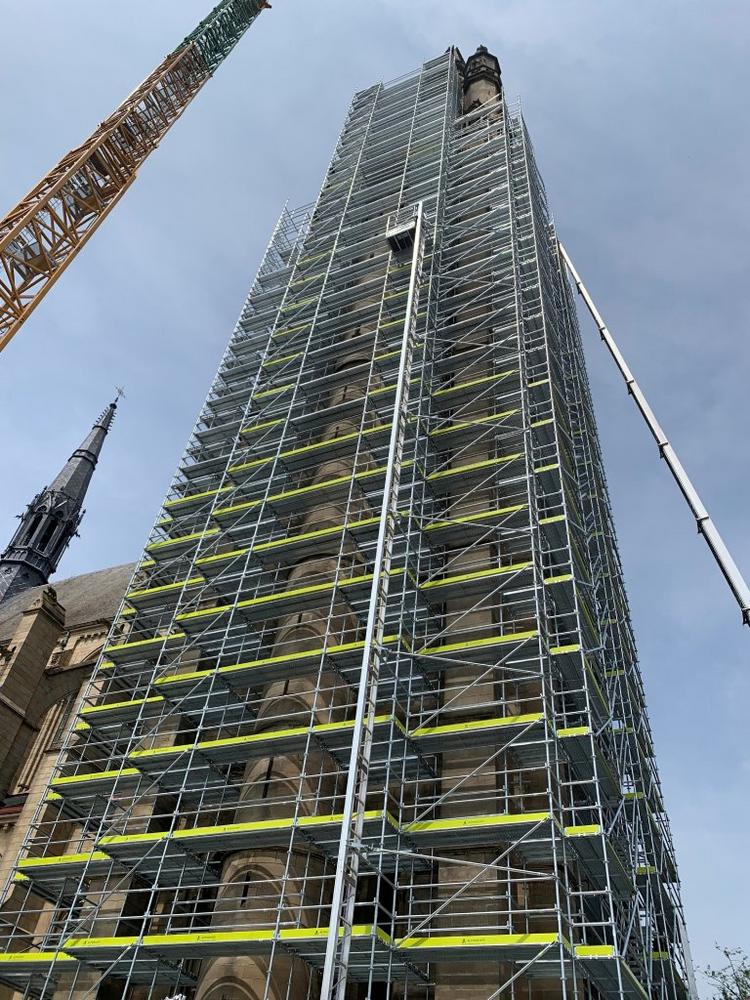 Following its successful use during the first phase of construction, the GEDA 200 Z Comfort is once again playing a key role in the renovation of the listed St. Martin’s Church in Arlon, Belgium. For the second time, scaffolding company Alphascaff is relying on the compact construction hoist to efficiently support scaffold assembly on additional sections of the church tower.