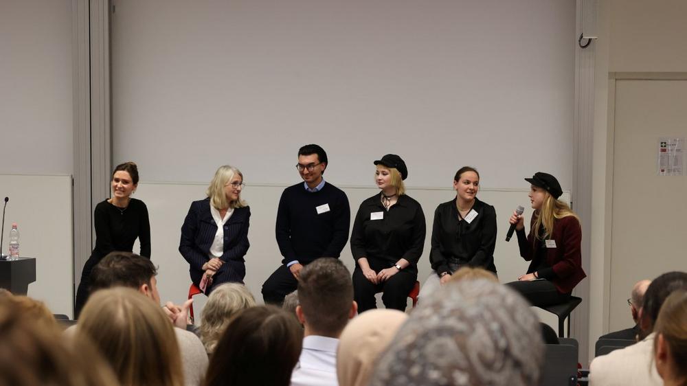 Dies zeigte auch die anschließende lebhafte Podiumsdiskussion mit sieben Studierenden aller vier Fachbereiche, Nina Poppel, Andrea Bähner und reger Interaktion mit dem Publikum. Zwar offenbarte sich eine große Spannbreite an Meinungen und Einstellungen zu den andiskutierten Themen, die einmal mehr deutlich machte, dass man nicht von „der“ jungen Generation oder „der“ Studierendenschaft sprechen kann, sondern einen differenzierteren Blick braucht. Doch waren sich alle in einer Hinsicht einig: „Es ist wichtig im Dialog zu bleiben und dieser Dialog sollte respektvoll sein.“ Und: Es brauche kritische Medienbildung – nicht nur für junge Menschen, sondern für alle Generationen. Eines gaben die Studierenden Andrea Bähner außerdem noch für die Landesregierung mit auf den Weg: Den Studierenden ist es wichtig, dass man mit ihnen redet und nicht bloß über sie.