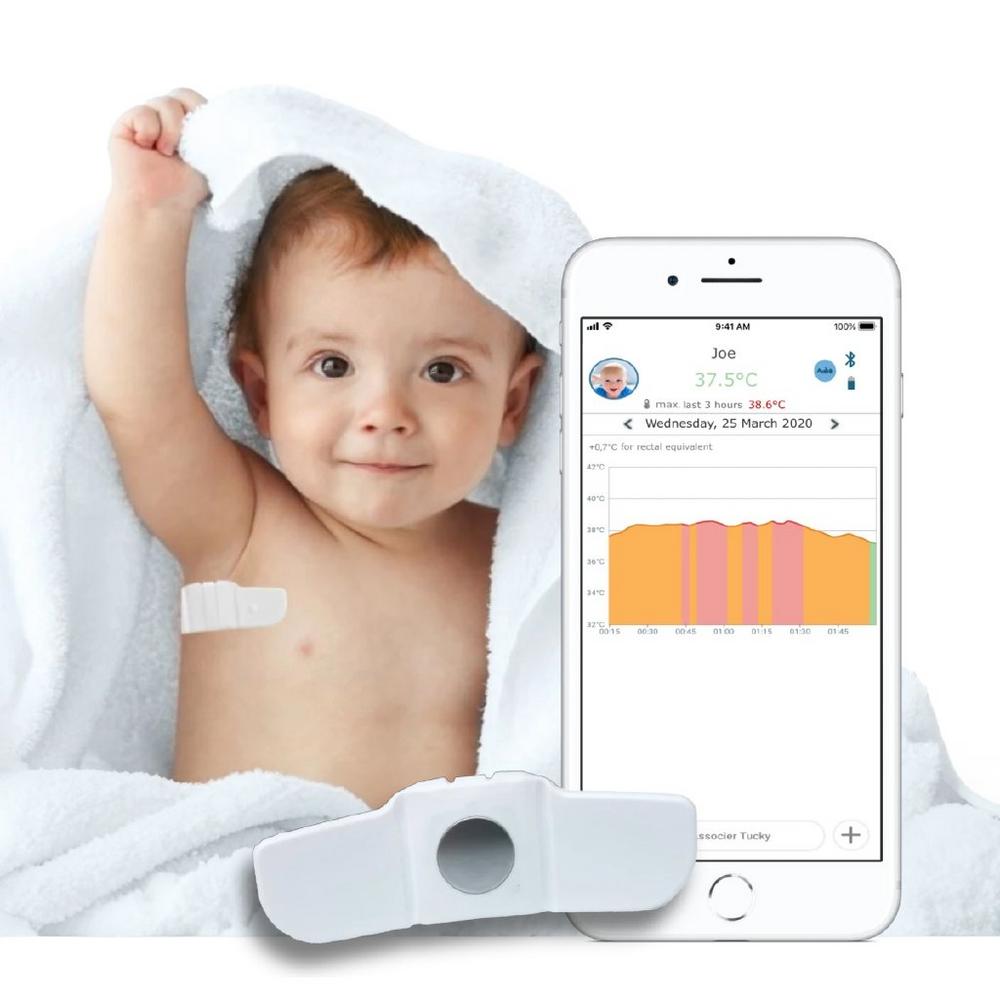 Das Tucky Smart-Pflaster wird unter der Achsel befestigt und überträgt kontinuierlich Temperatur- und Lagewerte via energiesparendem Bluetooth an eine App. Es wiegt nur acht Gramm, sendet 250-mal weniger Strahlung als ein Babyfon und ist dank hypoallergener Pflaster auch für empfindliche Haut geeignet.