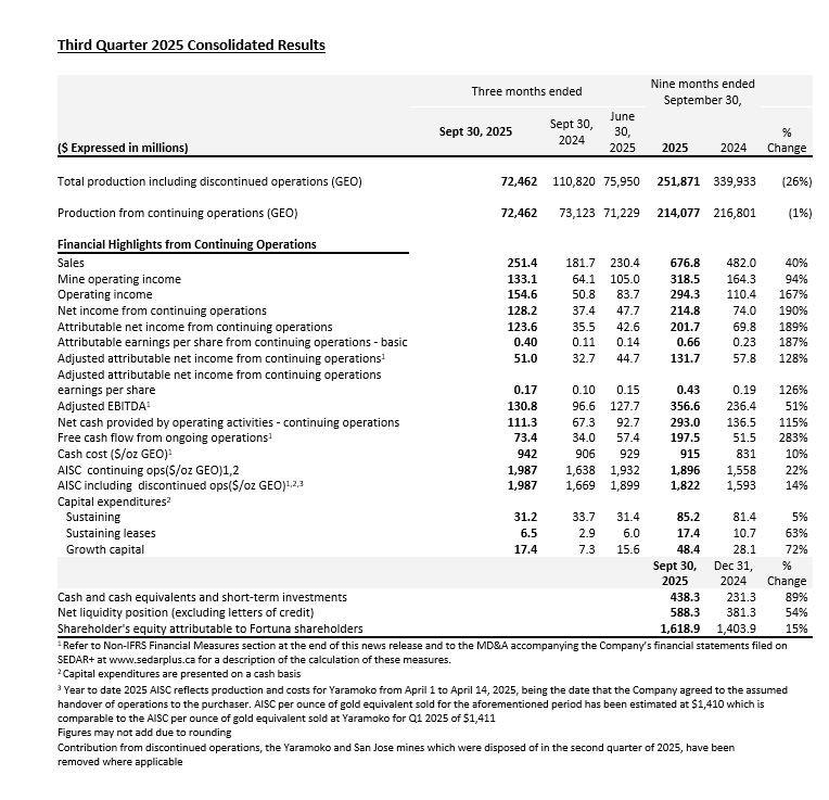 Fortuna Mining Corp. (NYSE: FSM | TSX: FVI) (“Fortuna” or the “Company”)https://www.commodity-tv.com/…/-(“Fortuna” or the “Company”) today reported its financial and operating results for the third quarter of 2025.