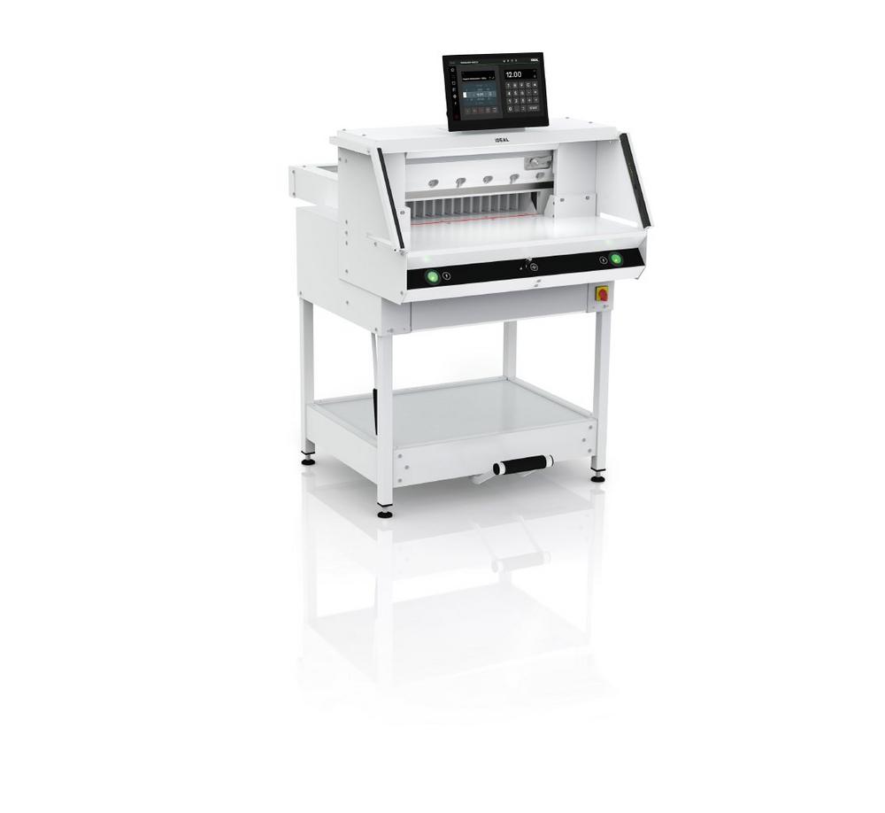 Im Antrieb der neuen Stapelschneider verhält sich die Hydraulikeinheit passiv und fungiert stattdessen als Kopplungsmechanismus und Druckverstärker. Im Wesentlichen besteht sie aus einer einzelnen Zylindereinheit mit Ölreservoir und Ventilsteuerung und kommt ohne eigene Hydraulikpumpe aus. Den Antrieb von Messer- und Pressbalken übernimmt ein Elektromotor. Er ist mit beiden Balken und der Hydraulik bewegungsgekoppelt und löst sowohl den Schnitt als auch die Papierpressung aus. Ein ausgeklügeltes mechanisches Umlenksystem sorgt dafür, dass sich der Pressbalken beim Schnittvorgang immer vorauseilend zum Messer nach unten bewegt und so die Klinge zur Sicherheit des Bedieners ständig abdeckt. Erst mit dem Aufsetzen des Pressbalkens auf dem Papierstapel wird Öl aus dem Presszylinder ins Reservoir verdrängt und dadurch die hydraulische Unterstützung aktiviert. Mit nur 250 ml Öl und 100 mm Hub realisiert die Einheit eine Papierpressung zwischen 250 daN und 1000 daN. Eine hohe Leistung, für die sie nur wenig Platz beansprucht. Denn die komplette Antriebseinheit passt – bei eingefahrenem Zylinder – einschließlich Ölreservoir, Ventilsteuerung und Servomotor in einen schmalen DIN A4-Ordner. Die Geräuschentwicklung des Antriebs bleibt moderat und ist selbst direkt neben der Maschine kaum wahrzunehmen.