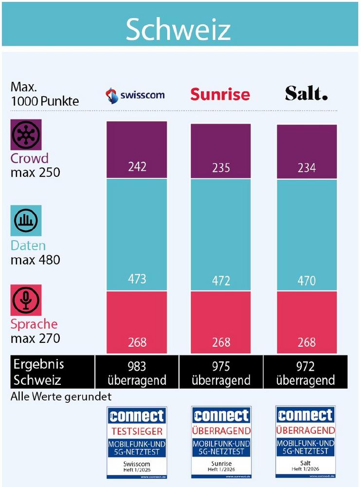 Bereits zum achten Mal in Folge erzielt die Swisscom den Gesamtsieg in der Schweiz und erreicht mit 983 von 1.000 möglichen Punkten erneut die Note „überragend“. Der Anbieter verbessert sich gegenüber dem Vorjahr um sechs Punkte – das ist auf diesem hohen Niveau bemerkenswert. Mit 975 Punkten erhält auch der zweitplatzierte Anbieter Sunrise die Note „überragend“. In der Sprach-Disziplin liegt der Netzbetreiber gleichauf mit Swisscom und Salt, in der Daten-Disziplin liegt Sunrise nur einen Punkt hinter Swisscom. Salt kommt auf Platz drei, mit 972 Punkten und der Note „überragend“. Mit einer Steigerung um 20 Punkte im Vergleich zum Vorjahr rückt der Anbieter auf nur noch 3 Punkte Abstand an Sunrise heran. Die Leistungen in allen Disziplinen sind top, beim 5G-Ausbau hat Salt vor allem auf dem Land zugelegt.