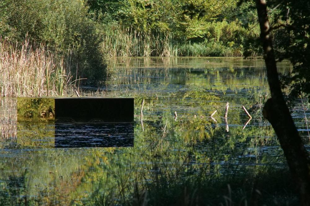 - Die Sonnenscheibe – ein Edelstahlsee im See. Eine Scheibe von fünf Metern Durchmesser liegt im Wasser, auf ihr ein Boot, das sich – ebenso wie die Bäume des Ufers und das herbstliche Laub – in der spiegelnden Fläche reflektiert. Es entsteht ein See im See, ein Raum im Raum – ein Ort der stillen Spiegelung.