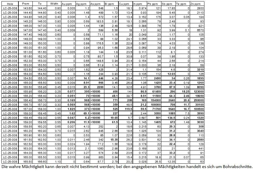 In Bohrloch LC-25-008 (Tabelle 1; Tabelle 2; Tabelle 3) wurde eine Alterationszone mit einer Massivsulfidmineralisierung von ca. 154,5 bis 165,0 Meter (10,50 Meter) bohrlochabwärts durchteuft. Die silberreiche Massivsulfidmineralisierung enthält Sphalerit, Galenit, Arsenopyrit und Pyrit (Abbildungen 3 und 4). Die Mineralisierung weist starke Anomalien in Bezug auf die Indikatorelemente Antimon, Wismut, Indium, Arsen und Tellur auf (Tabelle 1). Die Silberwerte variieren je nach Galenit-Sphalerit-Gehalt. Mit der hochgradigen Silbermineralisierung sind signifikante Goldwerte verbunden, die je nach Arsenopyrit-Gehalt variieren. Bemerkenswert ist das Vorhandensein von damit verbundenen erhöhten bis anomalen Tellurwerten, einem wichtigen Indikator für Goldmineralisierungen. Die Mineralisierung weist spät entstandene Verwerfungen und Brekziierung auf. Das Bohrloch endete in einem fein- bis mittelkörnigen Feldspat-Porphyr mit eingesprengtem Pyrit, was die Interpretation der Magnetik bestätigte.