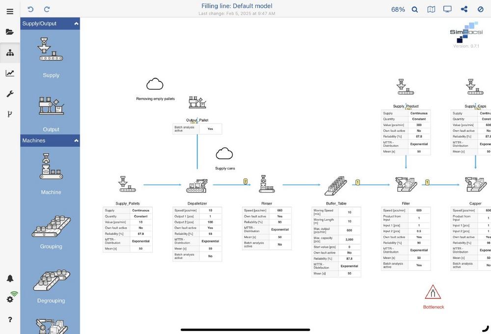 Im Gegensatz zu statischen Berechnungen berücksichtigt SimPacSi dynamische Parameter wie Störgrößen und Verfügbarkeiten. So lassen sich Engpässe frühzeitig erkennen und die Ressourcenzuweisung optimieren. Die integrierte Batchsimulation ermöglicht automatisierte Durchläufe mit variablen Laufzeiten und Wiederholungen, ergänzt durch detaillierte Auswertungen auf Maschinen- und Linienebene.