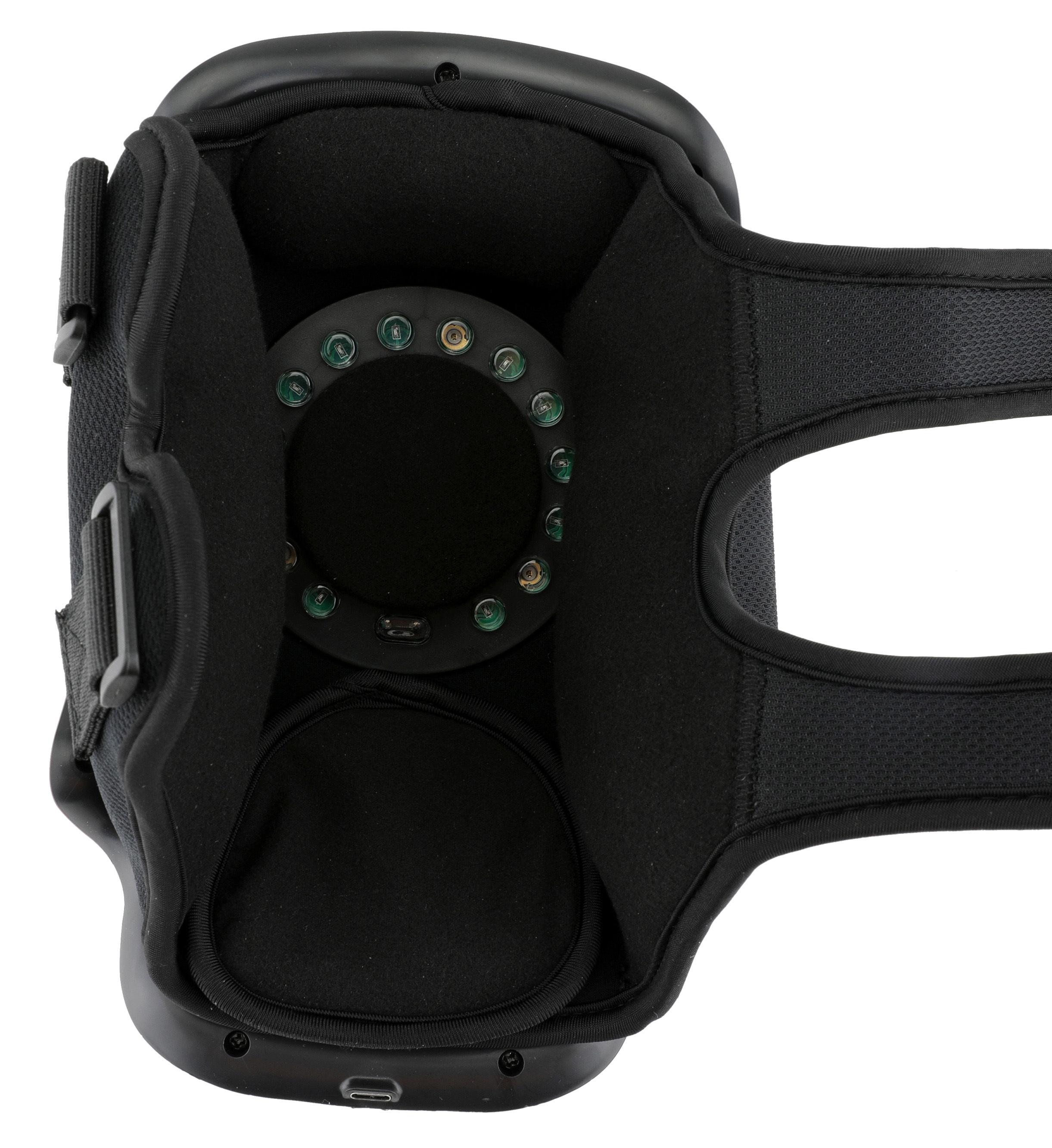 Flexible Befestigung: Die Klettbandbefestigung passt sich der individuellen Knieform an und hält das Gerät sicher an Ort und Stelle.