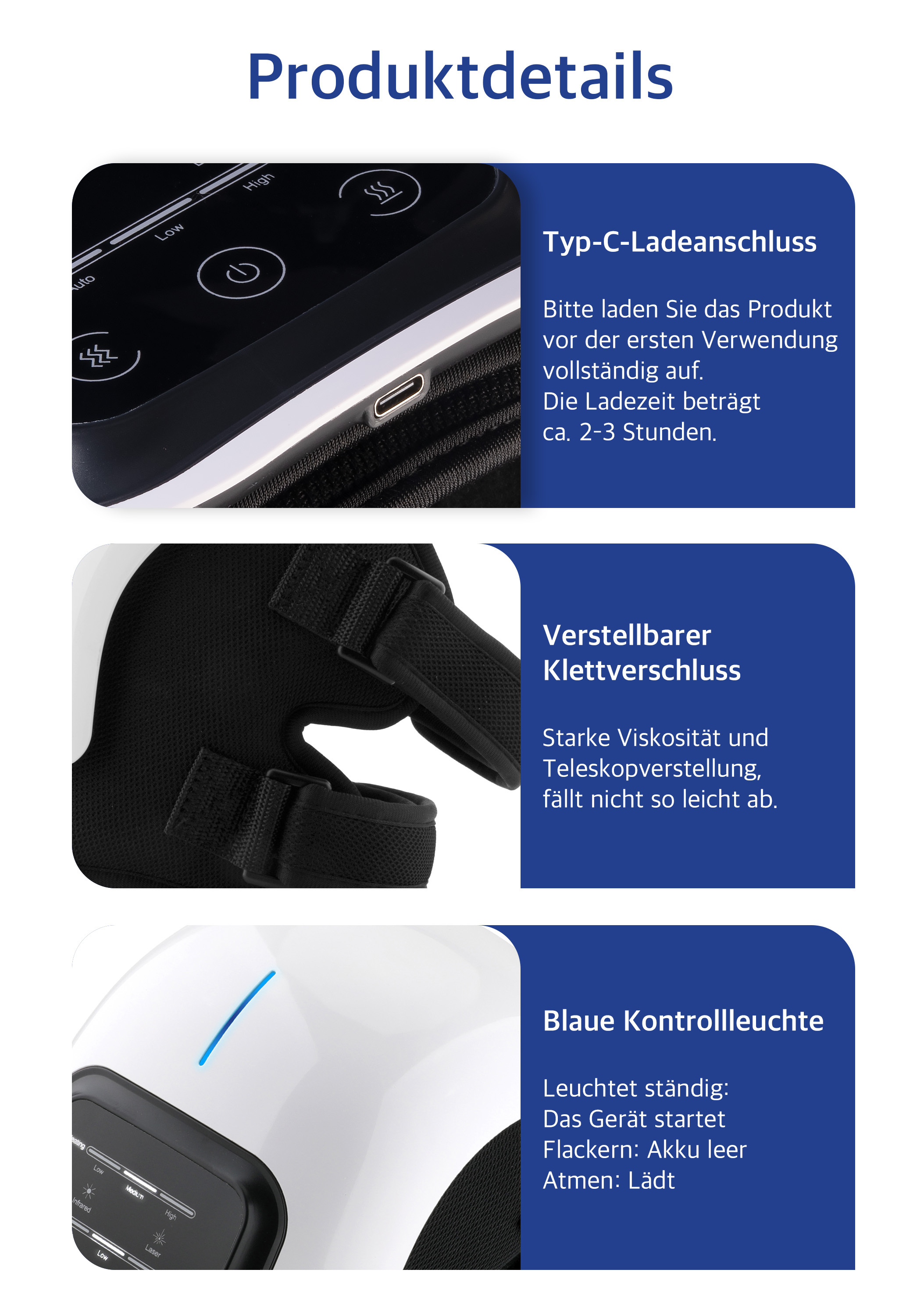 • Akku-Knie-Massagegerät inklusive USB-Ladekabel (USB-C auf USB-A) und deutscher Anleitung