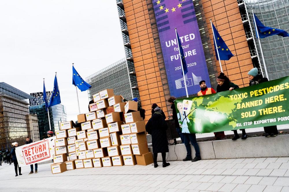 Zivilgesellschaftliche Gruppen aus aller Welt haben sich heute zusammengeschlossen, um die schädliche Doppelmoral der Europäischen Union anzuprangern. In einer symbolischen Aktion vor der Europäischen Kommission in Brüssel haben Aktivist*innen 75 Kartons zurückgegeben – einen für jeden in der EU verbotenen Pestizidwirkstoff, der aber weiterhin in großem Umfang ins Ausland exportiert wird.