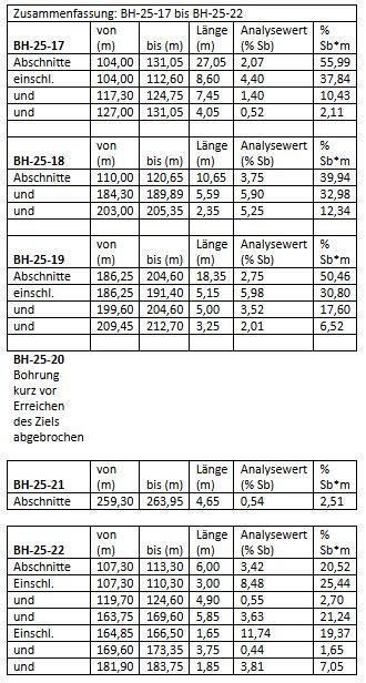 –          Die Bohrung BH-25-22 weist 6 einzelne Zonen mit Antimonmineralisierung auf.