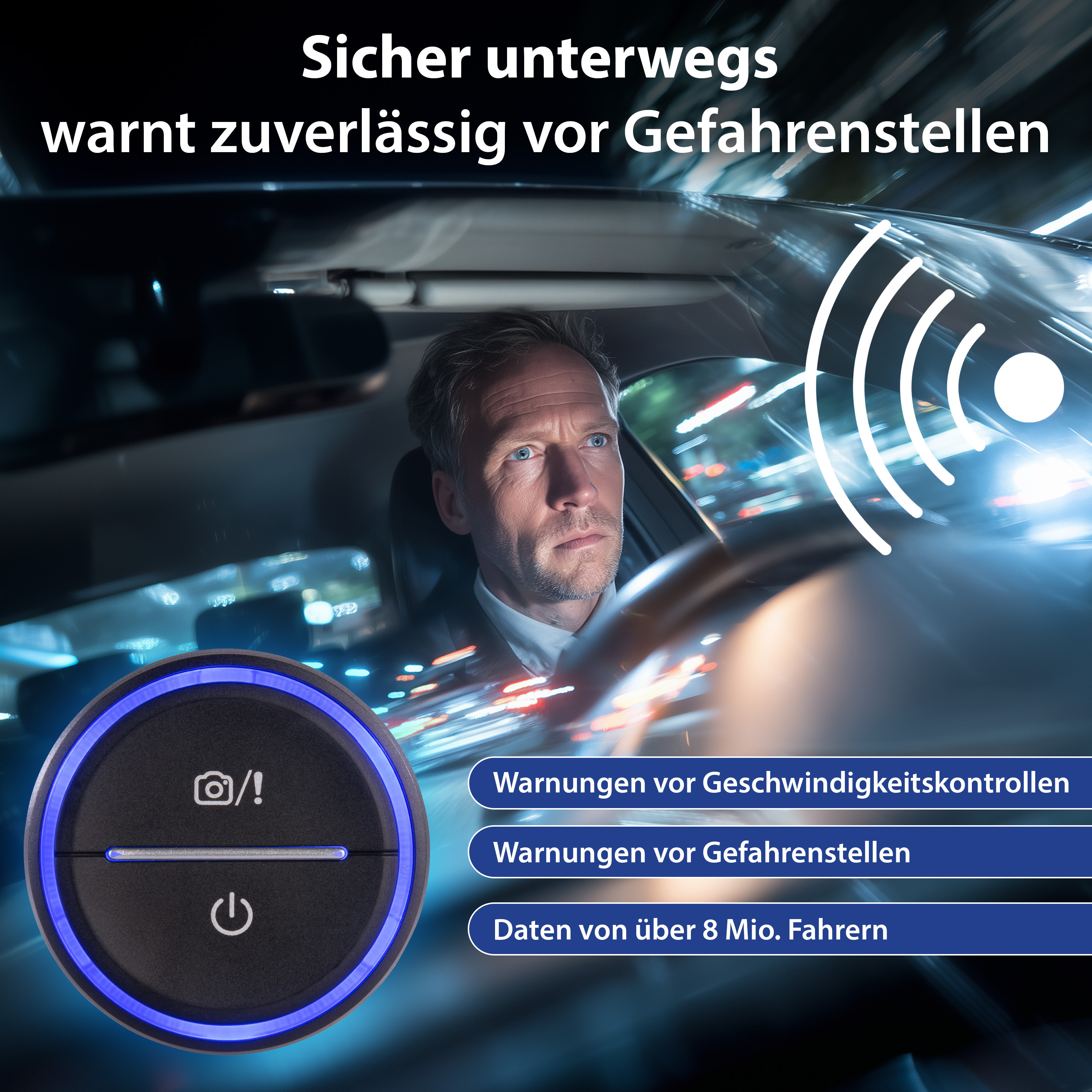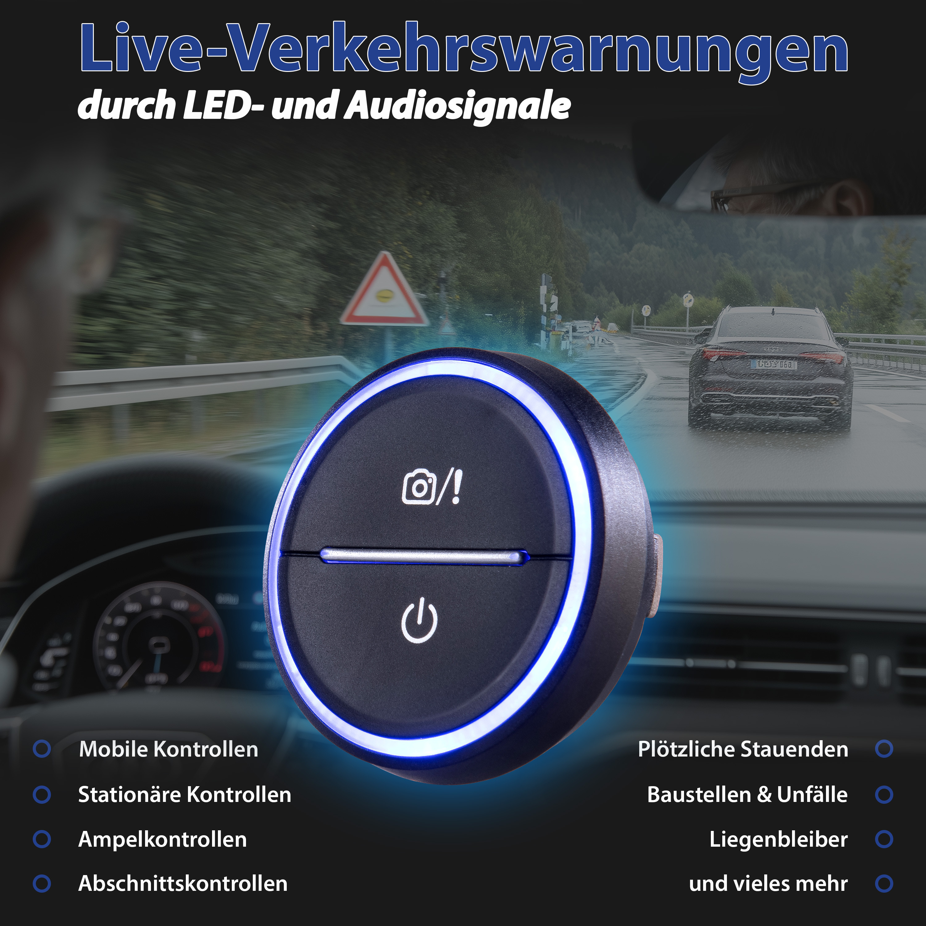 • Warnt optisch und akustisch vor bekannten Gefahrenstellen, Baustellen, Stauenden, Pannen u.v.m.