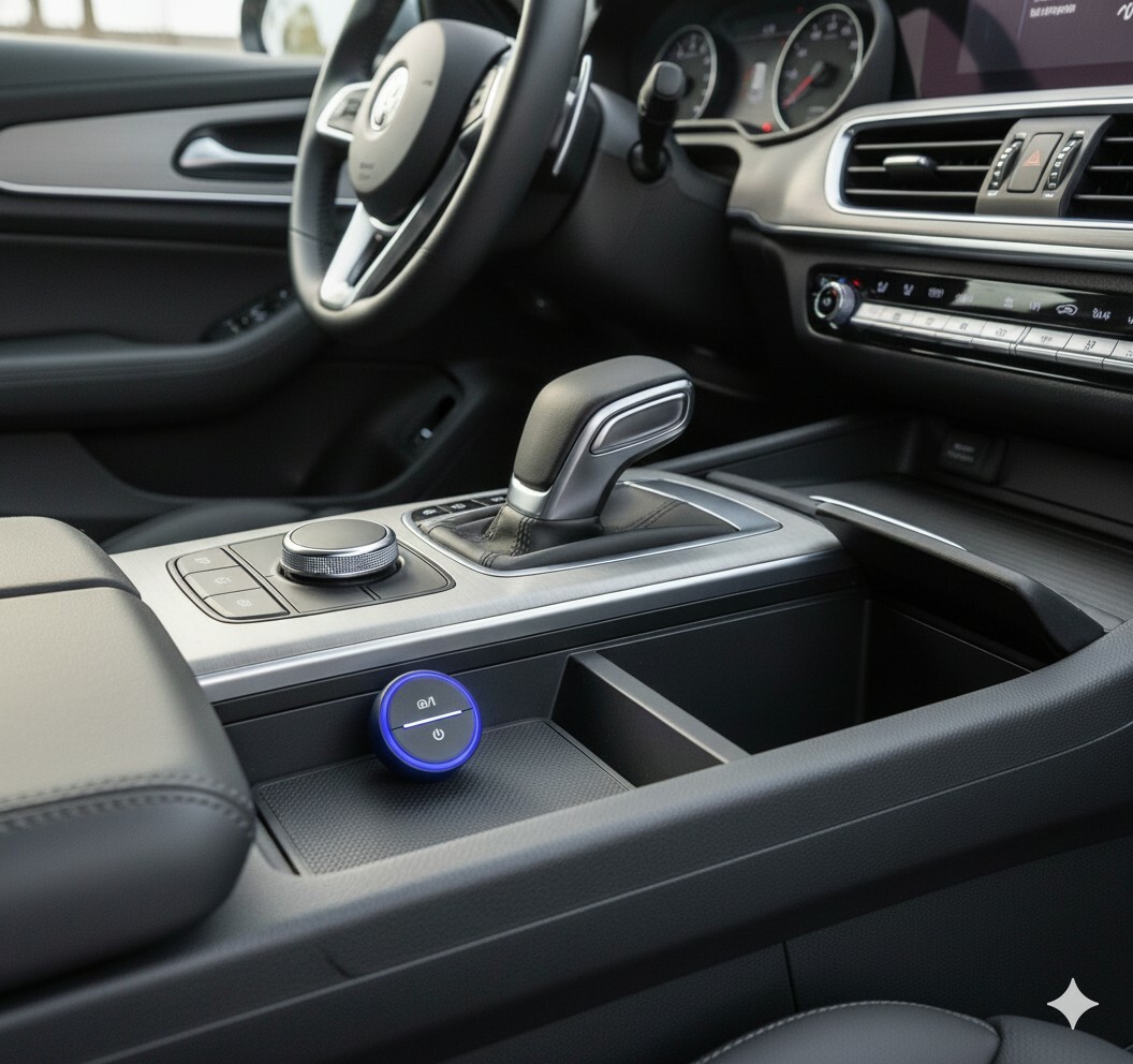 Kompakte Bauform: Das Design ist platzsparend gestaltet und fügt sich unauffällig in den Fahrzeuginnenraum ein. Das Gerät bleibt dabei zugänglich positionierbar.