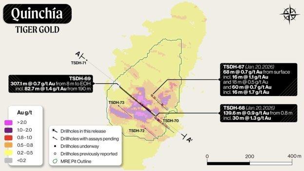 Zukunftsgerichtete Informationen in dieser Pressemitteilung umfassen unter anderem Aussagen zu den Zielen, Vorgaben oder Zukunftsplänen von Tiger; Aussagen zu Explorationsergebnissen, potenziellen Mineralisierungen, potenziellen Feeder-Zonen und dem Potenzial zur Erweiterung der Mineralisierung oder der Verbesserung des Gehalts, unter anderem durch Ergänzungs-, Erweiterungs- und Stepout-Bohrungen; die Pläne von Tiger zur Durchführung und zum Abschluss seiner Phase-1- und Phase-2-Explorationsprogramme, einschließlich Bohrprogrammen und Updates zur Mineralressourcenschätzung; Aussagen zu den geplanten Feldprogrammen und zukünftigen technischen Studien, einschließlich Studien auf Vormachbarkeits- und Machbarkeitsniveau; Explorations- und Projektentwicklungspläne für das Goldprojekt Quinchía und die Region; Aussagen zum regionalen Explorationspotenzial und zur Fähigkeit, Explorationsziele und Bohrziele zu entwickeln und Ressourcen zu definieren; den Aufbau von für beide Seiten vorteilhaften Partnerschaften mit lokalen und indigenen Gemeinschaften; dem Zeitpunkt der Aufnahme des Betriebs; und Schätzungen der Marktbedingungen. Zukunftsgerichtete Aussagen basieren auf Annahmen, die sich unter anderem auf die Verfügbarkeit von Bohrgeräten und anderen Gerätschaften, Auftragnehmern und Lieferungen, den fortgesetzten Zugang zum Projektstandort, den Erhalt der erforderlichen Genehmigungen und Zulassungen, die Fähigkeit des Unternehmens, die Unterstützung der Gemeinde und der Interessengruppen aufrechtzuerhalten, sowie die Tatsache, dass die Explorations- und Bohrergebnisse den Erwartungen des Managements entsprechen werden, beziehen. Zu diesen zukunftsgerichteten Informationen gehören auch Aussagen zur wirtschaftlichen Erstbewertung des Goldprojekts Quinchía, die per definitionem vorläufigen Charakter hat und vermutete Mineralressourcen umfasst, die aus geologischer Sicht als zu spekulativ gelten, um wirtschaftliche Überlegungen anzustellen, die eine Einstufung als Mineralreserven ermöglichen würden, und für die keine Gewissheit besteht, dass die beschriebenen wirtschaftlichen Aspekte oder Ergebnisse realisiert werden. Die Wirtschaftlichkeit von Mineralressourcen, die keine Mineralreserven darstellen, ist nicht nachgewiesen. Alle Verweise auf nahegelegene Projekte, Konzessionsgebiete oder Minen dienen lediglich der Veranschaulichung des regionalen Kontexts, und die Mineralisierung auf angrenzenden oder nahegelegenen Konzessionsgebieten ist nicht unbedingt ein Hinweis auf die Mineralisierung im Goldprojekt Quinchía.