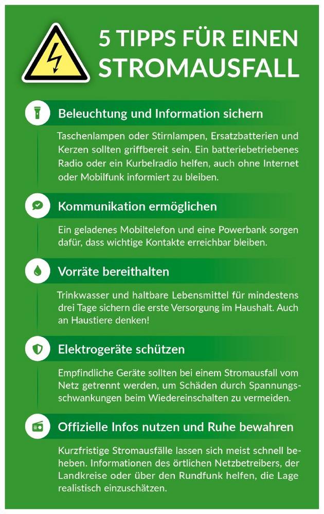 5. Ruhe bewahren und offizielle Informationen nutzen: Kurzfristige Stromausfälle lassen sich meist schnell beheben. Informationen des örtlichen Netzbetreibers, der Landkreise oder über den Rundfunk helfen, die Lage realistisch einzuschätzen.