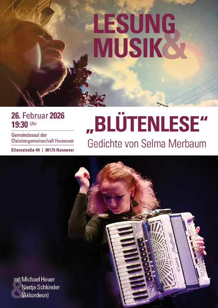 In der Lesung "Blütenlese" widmen sich der preisgekrönte Filmemacher Michael Heuer und die mehrfach ausgezeichnete Akkordeonistin Nastja Schkinder dem Werk von Selma Merbaum. Gespielt wird u.a. Musik von Rachmaninov, Scarlatti, Piazzolla und Rodrigo.