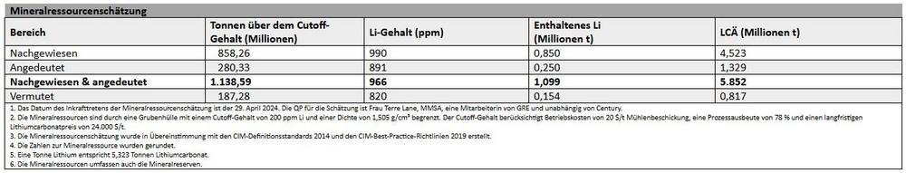Die Mineralressourcen werden durch eine Grubenhülle mit einem Lithium-Cutoff-Gehalt von 200 ppm begrenzt und gehen von einer Schüttdichte von etwa 1,5 Tonnen pro Kubikmeter („t/m³“) aus. Die Mineralressourcen umfassen auch die Mineralreserven. Höhere Ausbeuten, die in Pilotversuchen nachgewiesen wurden, hatten keinen wesentlichen Einfluss auf den ausgewählten Cutoff-Gehalt oder die gemeldete Tonnage oder den Gehalt der Mineralressourcen.