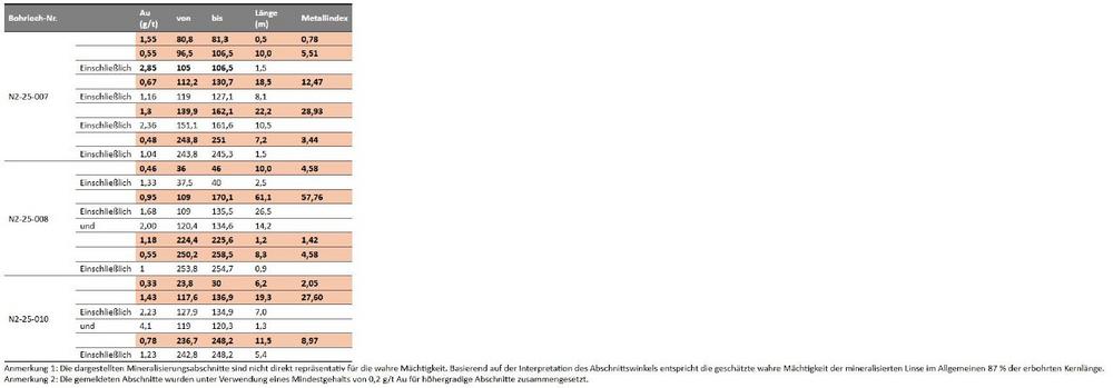 –          N2-25-012: 1,75 g/t Au über 30,4 Meter ab 64,1 Metern Bohrlochtiefe, 45,3 Meter vertikale Tiefe. Höhepunkt sind die Teilabschnitte von 10,5 Metern mit 3,51 g/t Au bzw. 0,51 Metern mit 19,2 g/t Au.