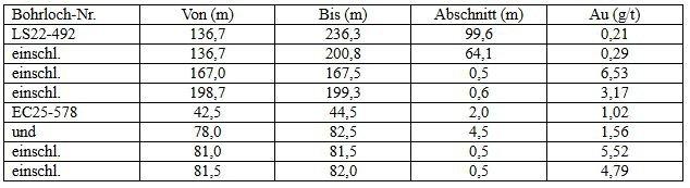 [3] Die geschätzten wahren Mächtigkeiten („ETW“) für die gemeldeten Gangabschnitte basieren auf hochgradig zuverlässigen orientierten Kernmessungen einzelner Gänge, sofern verfügbar, oder auf gemessenen Winkeln senkrecht zu den Gangrändern. Die ETW-Gangabschnittswinkel stützten sich auf Geometrien, die anhand einer 3D-Modellierung der Goldmineralisierungshülle unter Verwendung von Konturen mit einem Gehalt von 0,2 g/t Au geschätzt wurden, und stimmen mit diesen überein. Die gemessene und modellierte durchschnittliche Neigung des „geschichteten Erweiterungsgangs“ beträgt 35o in nordöstlicher Richtung, und der typische Neigungswinkel der Bohrlöcher beträgt 55o in südwestlicher Richtung. Möglicherweise sind weitere, potenziell schräg verlaufende goldmineralisierte Erzgänge (z. B. „Quarz-Brekzien-Erzgänge“) vorhanden. Die Unterschiede zwischen den einzelnen ETW und den bohrlochabwärts verlaufenden Abschnittslängen können je nach Azimut und Neigung des Bohrlochs, den Variationen im Streichen und Einfallen der Gangzonen und den Gesamtgeometrien der verschiedenen Gangsysteme zwischen den Bohrlöchern variieren.