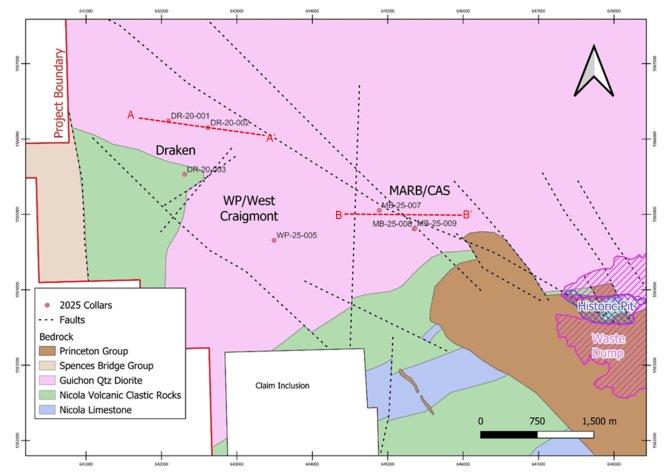 Im Rahmen des Programms 2025 von Nicola wurde auf drei Zielen (Abbildung 1) gebohrt: MARB-CAS, Draken und ein neues Ziel bei WP/West Craigmont, das von ALS Geoanalytics identifiziert wurde. Der Zweck des Programms 2025 bestand darin, geologische Daten zur Zielentwicklung auf einem potenziellen Porphyr-Kupfersystem bei New Craigmont zu sammeln.1