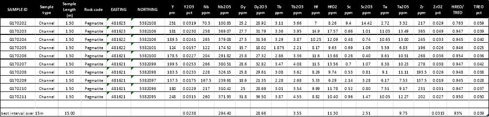 – Pegmatit-Schürfprobe (G170343):1.502,02 ppm Nb₂O₅ (0,1502 %) und 0,134 % TREO, einschließlich 124,52 ppm Dy2O3, 14,04 ppm Dy2O3, 16,5 ppm HfO2 und 14,42 ppm Sc2O3