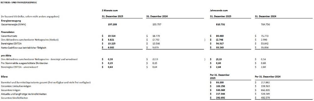 – Im Quartal zum 31. Dezember 2025 stieg die konsolidierte Energieproduktion im Vergleich zum Vorjahresquartal um 1 %, während die konsolidierte Jahresenergieproduktion für das zum 31. Dezember 2025 endende Geschäftsjahr 810.731 MWh betrug, gegenüber 764.756 MWh für das zum 31. Dezember 2024 endende Geschäftsjahr.