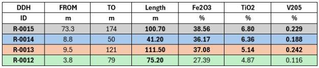– R-0013: Die Bohrung in R-0013 umfasst eine Oxidzone über eine Gesamtlänge von 180 m, mit einer hervorgehobenen Zusammensetzung von Fe2O3: 37,08 %; TiO2: 5,14 %, und V2O5: 0,242 % auf den ersten 111,50 m ab 9,5 bis 121 m.