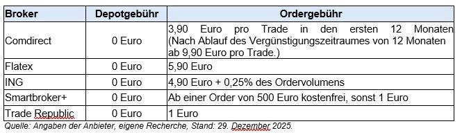Ein Beispiel für einen kostengünstigen Broker ist Smartbroker+. Dort zahlen Sie keine Depotgebühren. Ab 500 Euro Ordervolumen über die Börse gettex handeln Sie ab 0 Euro (zuzüglich marktüblicher Spreads zu Zuwendungen). Über den Broker können Sie ihre Wertpapiere auf 30 nationalen und internationalen Handelsplätze kaufen und verkaufen. Die Web-Anwendung und mobile App sind intuitiv gestaltet und bieten hilfreiche Tools und Features, um den Anlageerfolg zu optimieren. Bei Stiftung Warentest (12/2025) ging Smartbroker+ als Kostensieger in allen getesteten Depotgrößen hervor. Auch im Depottest 2026 von biallo.de liegt Smartbroker+ vorne, zusammen mit dem Konkurrenten Traders Place.