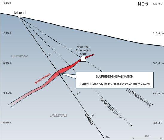 Bohrloch KVDD001 (das östlichste der drei Bohrlöcher) hat den Barytgang in der bislang größten Tiefe erprobt und eine Silber-Zink-Blei-Mineralisierung über einen Bohrabschnitt von 1,2 m mit 129 g/t Ag + 11,7 % Pb + 0,9 % Zn ab 28,2 m Tiefe durchteuft (einschließlich 0,7 m mit 218 g/t Ag + 20,0 % Pb und 1,4 % Zn), bestehend aus Einsprengungen und Bändern von Bleiglanz und Sphalerit. Die Bohrungen werden relativ orthogonal zum Barytgang niedergebracht.