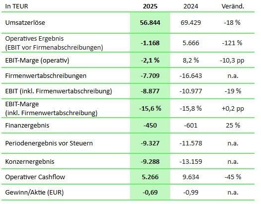 Die SYZYGY AG hat im Geschäftsjahr 2025 nach bestätigten Zahlen Umsatzerlöse in Höhe von EUR 56,8 Mio. erzielt. Der Rückgang der Umsatzerlöse um 18 Prozent lag dabei im Rahmen der Erwartungen. Das operative Ergebnis vor Firmenwertabschreibungen war negativ mit EUR -1,2 Mio. Das Ergebnis wurde durch zusätzliche Restrukturierungsaufwände in Höhe von EUR 0,5 Mio. im vierten Quartal belastet. Entsprechend beträgt die operative Marge -2 Prozent (Vorjahr: 8 Prozent).