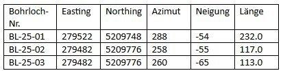 Die Ergebnisse der jüngsten Bohrungen zeigen in den Bohrlöchern BL-25-01 und BL-25-03 Abschnitte mit anomalen Kupferwerten, die mit Zonen in Verbindung stehen, die laut Beschreibung Massivsulfide enthalten (Tabelle 2). In Bohrloch BL-24-02 wurde keine Massivsulfidmineralisierung durchschnitten. Dieser Bohrlochabschnitt wies reichlich Quarzerzgänge mit Sulfiden auf und es wurde nur Gold analysiert, wobei keine bedeutsamen Goldwerte verzeichnet wurden. Es muss darauf hingewiesen werden, dass das Bohrloch das geplante Ziel möglicherweise nicht erreicht hat.