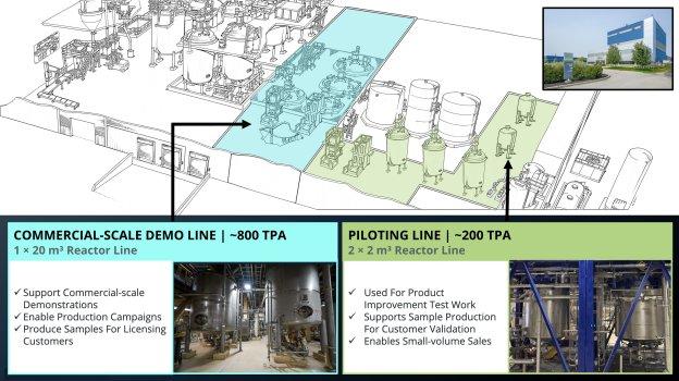 Die Ende 2023 in Betrieb genommene Pilotlinie besteht aus zwei 2-Kubikmeter-Reaktoren und dient dem Scale-up, der Kundenqualifizierung sowie der Produktion kleiner Mengen.