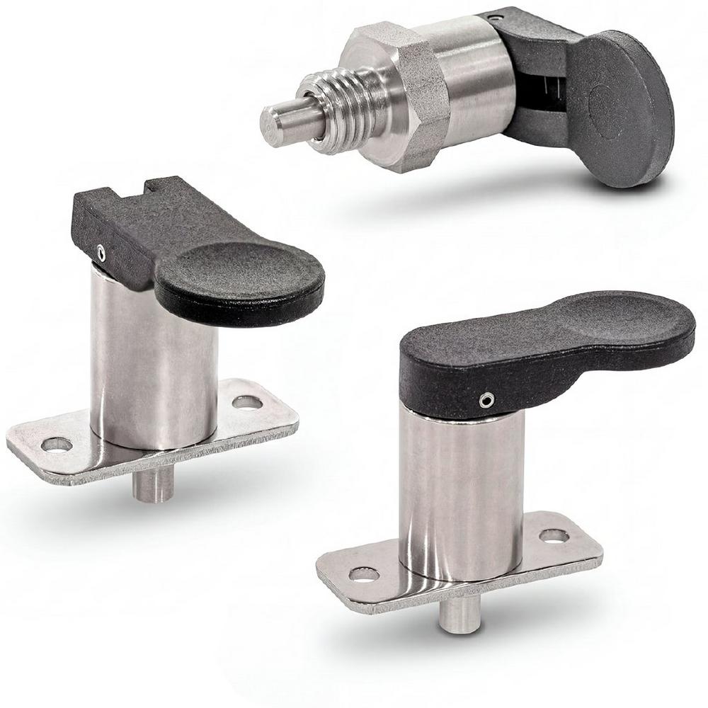 GN 823 steht in zwei Einbauvarianten zur Verfügung: zum Einschrauben mit kurzem Regel- oder Feingewinde M10 bis M16 sowie mit Anschraubflansch mit zwei seitlichen Befestigungsbohrungen. Sämtliche Bauteile, also Führung, Raststift und Druckfeder, bestehen aus korrosionsbeständigem Edelstahl. Der schwarze Hebel aus glasfaserverstärktem Polyphthalamid (PPA) hält auch rauen Umgebungsbedingungen stand. Während der Hebel der Einschraubvariante um 360 Grad drehbar ist, bietet die Flanschversion, falls gewünscht und per Form wählbar, eine Verdrehsicherung. Dadurch steht der Hebel dann parallel oder rechtwinklig zur Montagerichtung – das unterstützt unter anderem die Blindbedienung.