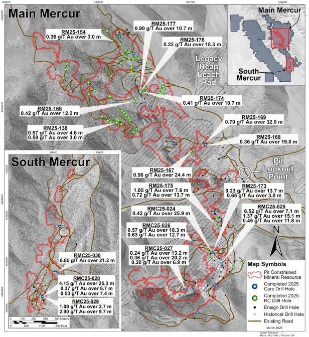 Das Bohrprogramm 2025 bei Mercur wurde im Dezember mit 115 fertiggestellten RC- und Kernbohrlöchern abgeschlossen. Bislang wurden die Ergebnisse von 107 Bohrlöchern veröffentlicht. Die gesammelten Daten werden die geplante Vormachbarkeitsstudie des Unternehmens unterstützen, deren Veröffentlichung für das erste Quartal 2027 vorgesehen ist und die einen wichtigen Meilenstein auf dem Weg zur Wiederaufnahme der Goldproduktion bei Mercur darstellt. Abbildung 1 zeigt die Standorte der Bohrlöcher bei Main Mercur.