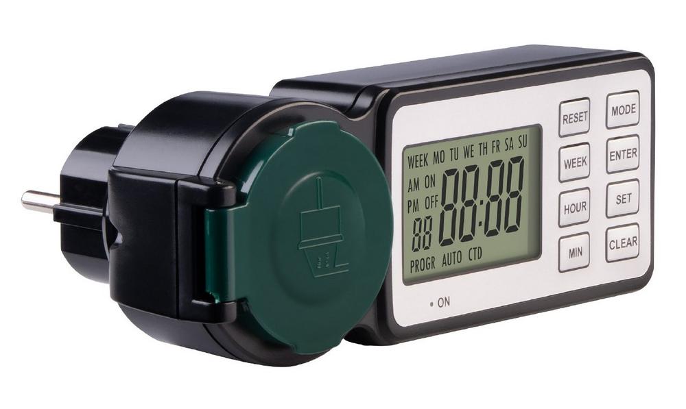Für die automatische Zeitsteuerung von Außenbeleuchtung, Gartenpumpen und anderen elektrischen Geräten im Freien: Die digitale Outdoor-Zeitschaltuhr von revolt ermöglicht die minutengenaue Programmierung von bis zu zwölf Ein- und Ausschaltzeiten pro Tag. Diese lassen sich wahlweise auf einzelne Wochentage, alle Tage, Werktage oder das Wochenende legen. Ein einstellbarer Ausschalt-Countdown von bis zu 99 Stunden und 59 Minuten ergänzt die Zeitprogramme um eine flexible Abschaltfunktion. Das übersichtliche Display und die klar beschrifteten Tasten ermöglichen eine unkomplizierte Bedienung. Eine Knopfzelle sichert die gespeicherten Einstellungen bei Stromausfall. Dank des spritzwassergeschützten Gehäuses und der Schutzkontakt-Steckdose mit Schutzkappe ist die Zeitschaltuhr für den Einsatz im Außenbereich geeignet.