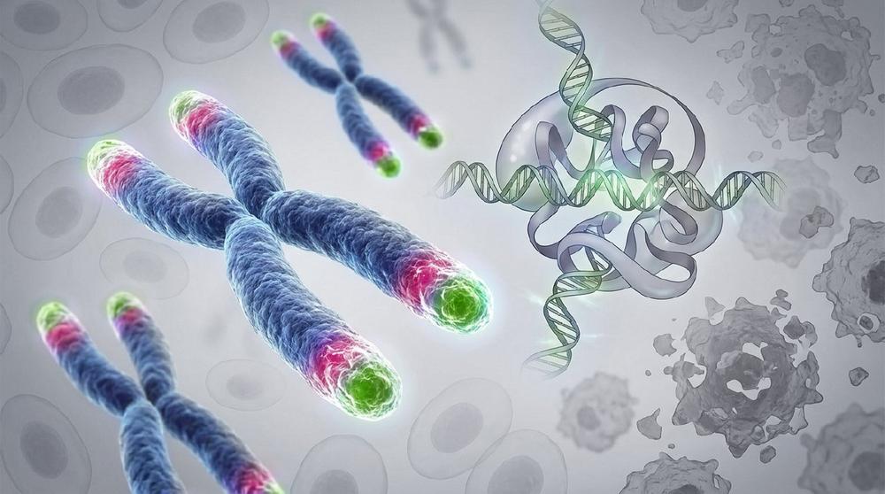 Telomere befinden sich an den Enden der Chromosomen und schützen die DNA vor Schäden. Bei jeder Zellteilung verkürzen sich diese Strukturen ein wenig. Werden Telomere zu kurz, kann sich eine Zelle nicht mehr teilen – sie altert oder stirbt ab. Dieser Prozess gilt als einer der grundlegenden biologischen Mechanismen des Alterns und steht mit vielen altersbedingten Erkrankungen in Verbindung.