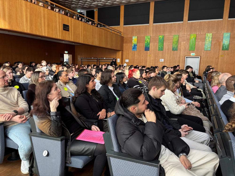 In der Aula der Hochschule begrüßten Präsident Prof. Dr. Gunther Piller und Vizepräsidentin Prof. Dr. Edith Rüger-Muck die (nach vorläufigen Zahlen) rund 500 neuen Bachelor- und Masterstudierenden im Namen der Hochschule. Auch Oberbürgermeister Prof. Dr. Klaus Blettner ließ es sich nicht nehmen, die neuen Studierenden persönlich in Ludwigshafen willkommen zu heißen. Anschließend skizzierten Studentin Anna-Lena Schäfer und Antonia Zwicker von der Hochschulkommunikation die Standorte und Fachbereiche der Hochschule. Prof. Dr. Birgit Angermayer stellte sich in ihrer Rolle als Vertrauensdozentin vor und Claudia Sigmund präsentierte das Angebot des hochschuleigenen AI-Literacy Centers, das Studierende und Lehrende fit macht für die Anforderungen des Hochschul- und Arbeitslebens mit KI. Anschließend gab Diversity Managerin Petra Schorat-Waly Einblick in den Bereich Diversity und stellte das Cross Culture Mentoring Programm und den von der Fachschaft des Fachbereichs IV initiierten und organisierten Black History Month vor. Zum Abschluss präsentierten Vertreter*innen des AStA und StuPA die Handlungsfelder und das Angebot des Allgemeinen Studierendenausschusses und des Studierendenparlaments, während das Studierendenwerk Vorderpfalz, die Hochschulseelsorge und die Initiative ArbeiterKind.de ihr ihr Beratungs- und Betreuungsprogramm skizzierten.