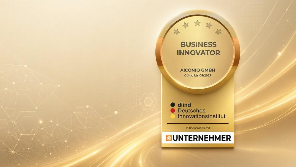AICONIQ wurde vom Deutschen Innovationsinstitut für Nachhaltigkeit und Digitalisierung mit dem Siegel „Business Innovator“ ausgezeichnet. Für uns ist das mehr als eine Ehrung — es ist eine Bestätigung unseres Anspruchs, KI nicht nur technologisch, sondern organisatorisch und strategisch wirksam zu machen.