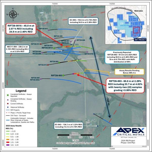 Apex Critical Metals Corp. (CSE: APXC | OTCQX: APXCF | FWB: KL9) („Apex“ oder das „Unternehmen“), ein kanadisches Mineralexplorationsunternehmen, das sich auf den Ausbau seines strategischen zu 100 % unternehmenseigenen Seltenerdmetallprojekts Rift im Karbonatitkomplex Elk Creek im Südosten des US-Bundesstaates Nebraska konzentriert, freut sich, die Analyseergebnisse des Bohrlochs RIFT26-001A und die Teilergebnisse aus dem Bohrloch RIFT26-003 bekannt zu geben. Es ist dies die zweite Charge von Ergebnissen aus der Bohrkampagne 2026 des Unternehmens; weitere Analyseergebnisse werden veröffentlicht, sobald sie vorliegen, geprüft und ausgewertet wurden.