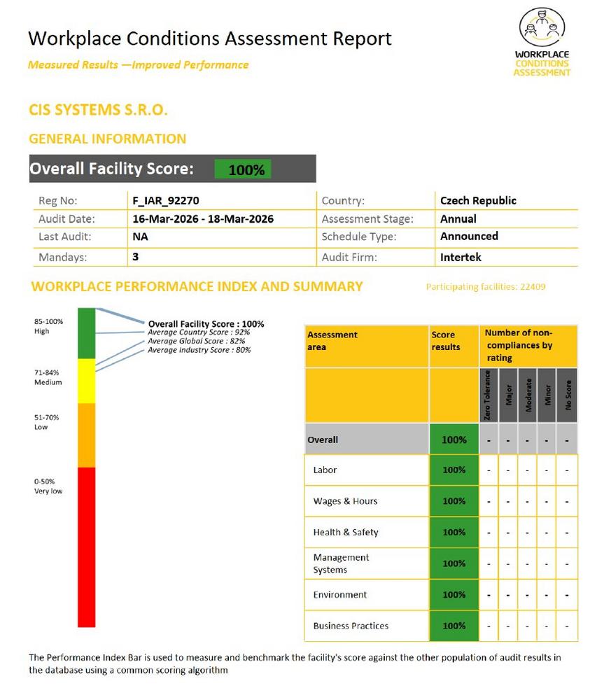 Das WCA-Audit bewertet unter anderem Arbeitsbedingungen, faire Vergütung, Arbeitszeiten, Gesundheitsschutz, Managementsysteme, Umweltaspekte sowie ethisches Geschäftsverhalten. Die erneute Bestbewertung in allen Bereichen unterstreicht, dass diese Aspekte bei CiS fest im operativen Alltag verankert sind und von den Mitarbeitenden aktiv gelebt werden.