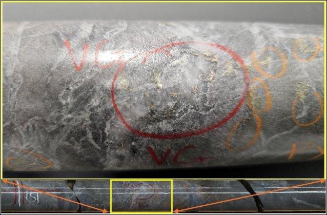 Das Bohrloch N2-26-24, das im Rahmen der südwärts gerichteten Erweiterungsbohrungen abgeteuft wurde, um das Potenzial für eine Ausweitung der Zone A zu bewerten, ist ein steilwinkeliges und tiefes Loch, in dem der senkrechte Verlauf einer beachtlichen Goldmineralisierung unterhalb des bekannten Nordkorridors bzw. außerhalb der aktuellen Abgrenzungen erkundet werden soll. Das Unternehmen gibt daher mit Freude bekannt, dass in einer Tiefe von rund 151,1 Metern sichtbares Gold angetroffen wurde, das sich auf einem 1 cm breiten Stockwerk-Äderchen aus Quarz, Ankerit und Pyrit konzentriert. Die Mineralisierung ist mit Pyritversprengungen innerhalb eines schieferartigen, mäßig ankeritisierten und schwach serizitisierten chloritisierten Basaltkörpers assoziiert und korreliert mit der Mineralisierung, die in den goldführenden Zonen A und RJ insgesamt beobachtet wurde.