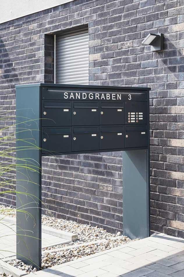 Freistehende Briefkastenanlagen lassen sich individuell konfigurieren. Verarbeitet werden Edelstahl oder verzinktes Stahlblech mit Pulverbeschichtung. Farblich stehen Anthrazitgrau RAL 7016, Verkehrsweiß RAL 9016 sowie optional die gesamte RAL-Palette zur Auswahl. Die Anordnung der Fächer kann waagerecht oder senkrecht erfolgen. Zusätzlich lassen sich Klingelanlagen, Video oder Sprechanlagen sowie weitere Komponenten der Türkommunikation integrieren.