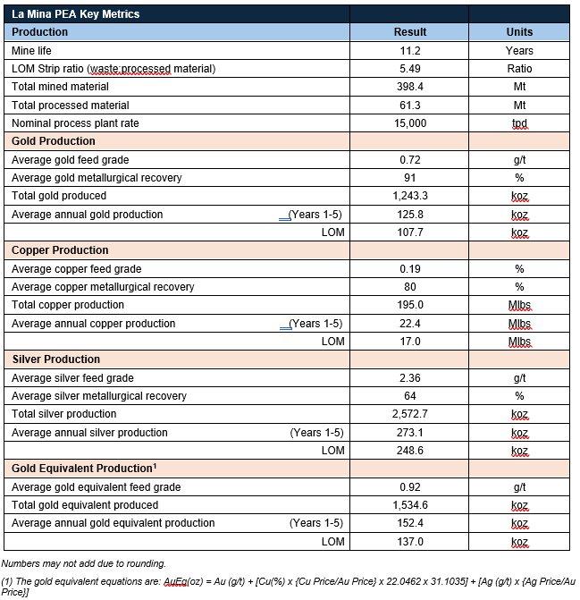 - Strong Production Profile: Average annual production of 152.4 koz Au equivalent ("AuEq") over the first five years of operation, and total life of mine ("LOM") production of 1.5 Moz AuEq (comprising 1.2 Moz Au, 2.6 Moz Ag, and 195 Mlbs Cu) over an 11.2 year projected mine life.