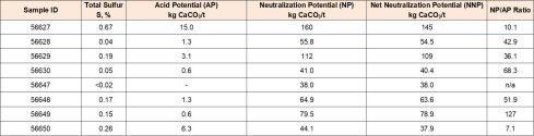 Die geochemische Charakterisierung ist eine Standard-Umweltstudie für Metallbergbauprojekte. Diese Untersuchungsarbeiten dienen dazu festzustellen, ob die verschiedenen Gesteinsarten, die im Rahmen des Projekts abgebaut werden sollen, das Potenzial haben, langfristig reaktiv zu sein (Säurebildung, die zur Freisetzung von Metallen führt). Frühere begrenzte Untersuchungen an einer kleinen Anzahl von Nebengesteinsproben aus New Amalga, die in den Jahren 2020-2021 durchgeführt wurden, lieferten günstige Ergebnisse und belegten bei allen getesteten Proben signifikante Netto-Säure-Neutralisationsverhältnisse (Tabelle 1).