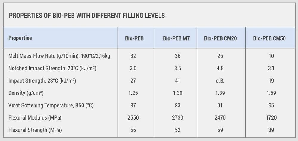 While standard bio sourced solutions such as PLA, PHA, PHB and others have technical limitations, the Bio-PEB compounds offer an outstanding combination of properties between impact, chemical resistance, thermal resistance and processing without compromise on surface quality.