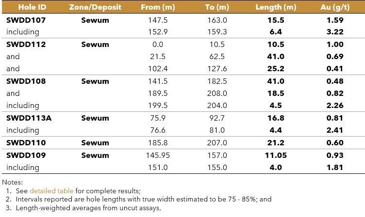 Highlights from Diamond Drilling at the Sewum Gold Deposit at Enchi