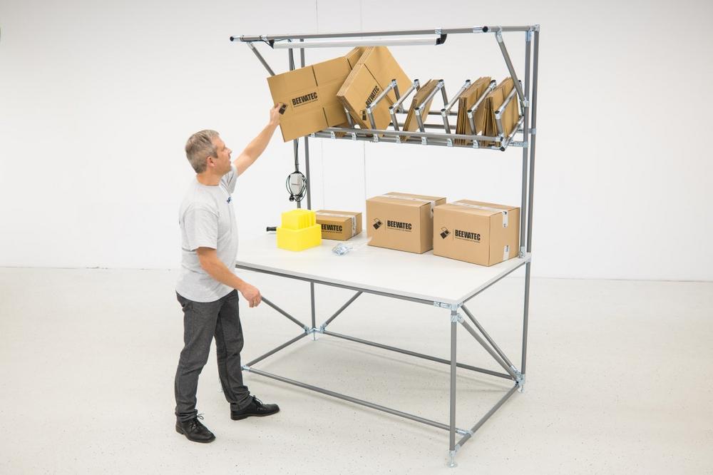 Durch Baukastensysteme können Packplätze individuell konfiguriert werden – je nach Produkt, Verpackungsart oder Prozessschritt. Erweiterungen wie Ablagen, Rollenbahnen oder Beleuchtungssysteme lassen sich einfach integrieren.