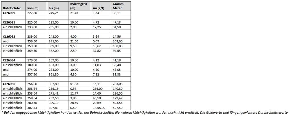 –          Bohrloch CL26032 durchteufte 5,07 g/t Au auf 21,50 m ab 359,50 m