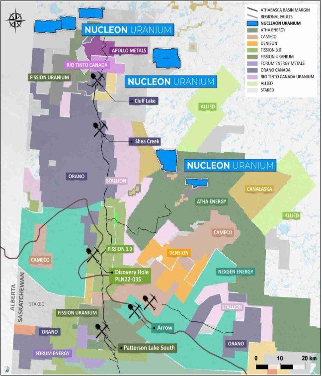 Der westliche Teil des Uranprojekts Nucleon befindet sich innerhalb eines regionalen Strukturkorridors des Athabasca-Beckens, der mehrere bekannte Uranlagerstätten beherbergt, darunter die Lagerstätte Patterson Lake South (PLS) von Fission Uranium und die Lagerstätte Arrow von NexGen Energy. Diese Lagerstätten stehen in räumlichem Zusammenhang mit im Grundgebirge beherbergten und diskordanzgebundenen Uransystemen, die von großen Verwerfungszonen, graphithaltigen Leitern und reaktivierten Grundgebirgsstrukturen kontrolliert werden.