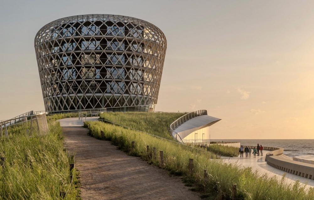 Entworfen von ZJA Architects & Engineers in Zusammenarbeit mit DELVA Landscape Architecture & Urbanism, verfolgt das Projekt einen konsequent integrativen Ansatz: Das Gebäude ist nicht als Fremdkörper gedacht, sondern als Fortführung der Küstenlinie. Die begehbare Dachfläche greift die Topografie der umliegenden Dünen auf und macht sie für Besucherinnen und Besucher erlebbar. So entsteht ein öffentlich zugänglicher Dachpark mit weitem Blick über Meer und Stadt – ein fließender Übergang vom Strand auf das Gründach.